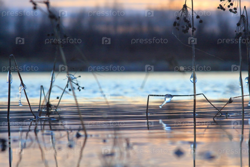 Прибрежная ростительность у берега реки Иртыш с ледяными сосульками