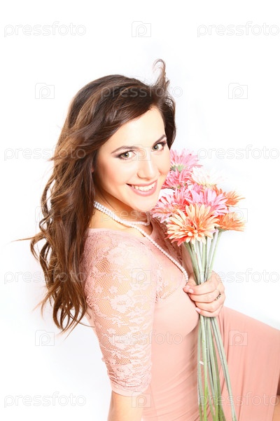 Счастливая брюнетка с букетом гербер на белом фоне