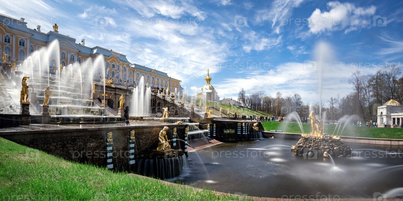 Вид на фонтанный комплекс Петергофского дворца в мае