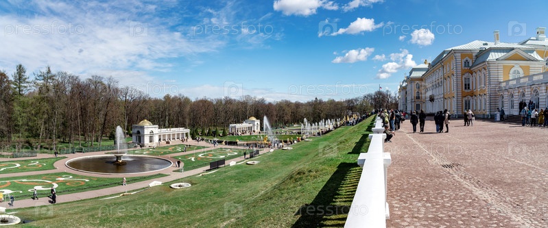 Вид на фонтанный комплекс Петергофского дворца в мае