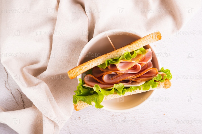 Крупный план сэндвича с ветчиной, сыром и луком в миске на столе