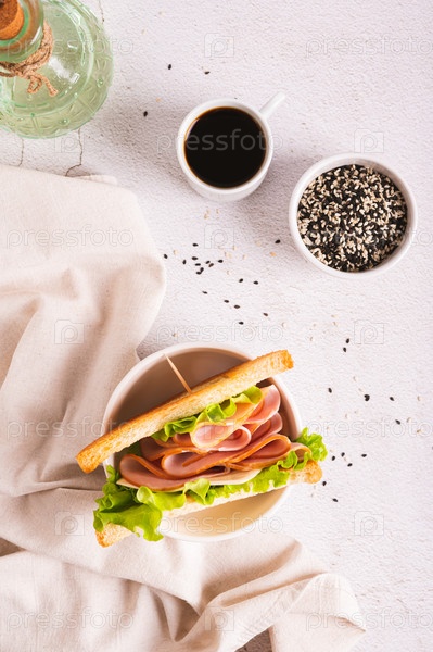 Тост-сэндвич с ветчиной, сыром и зеленью в миске на столе и вертикальный вид