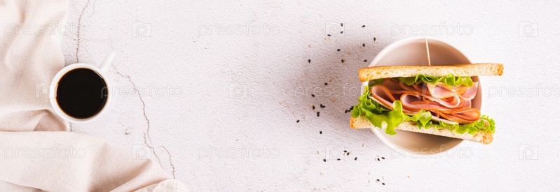 Тост-сэндвич с ветчиной, сыром и зеленью в миске на столе, вид веб-баннера