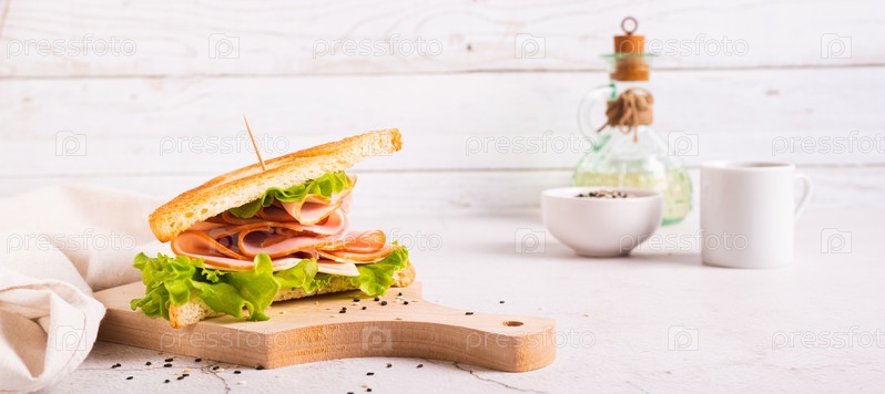Сэндвич с ветчиной, сыром и луком на деревянной доске на веб-баннере стола