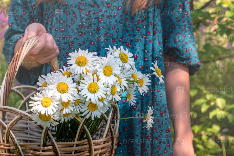 Корзина с ромашками в руках женщины в традиционном крестьянском платье