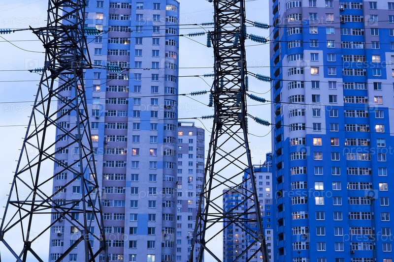 Опоры ЛЭП на фоне многоэтажных жилых домов в вечернем освещении