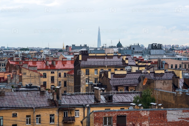 Вид сверху на городские крыши в историческом центре Санкт-Петербурга
