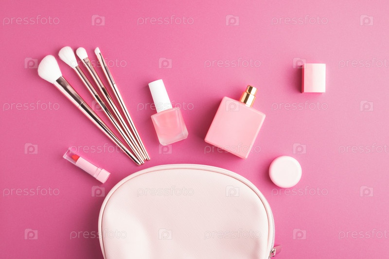 косметичка; розовый; косметика; парфюм; духи; вид сверху; стол; кисти; лак для ногтей; помада; предмет; аксессуар; отдельный; сверху; визажист; сумка; макияж