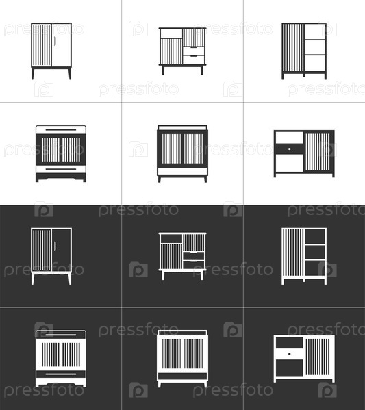 Тумбочки. Набор плоских мебельных иконок. Черные и белые