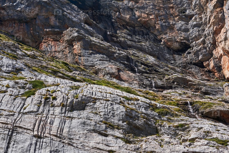 Отвесная каменная стена со стекающим по ней небольшим водопадом