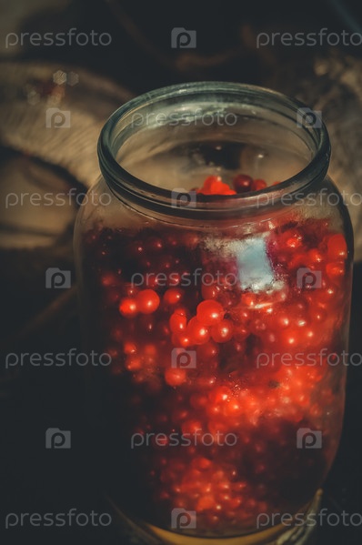 Сбор ягод в стеклянных банках. Костяника, костяника, рубус саксатилис. Деревенский стиль, темное фото, пространство для копирования, вертикальная композиция