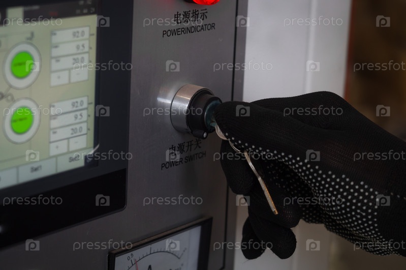 Рука механизатора в черной перчатке поворачивает ключ, чтобы включить оборудование на заводе. Выключите машину, повернув главный выключатель питания на панели управления. Селективный фокус