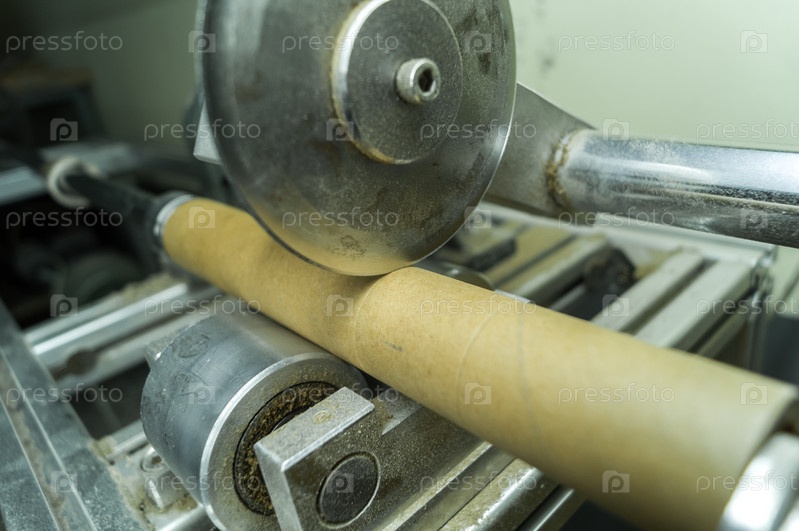 Станок для резки картонной втулки для типографии. Резка картонных катушек и катушек для намотки бумаги и пленки. Оборудование для производства. Селективный фокус