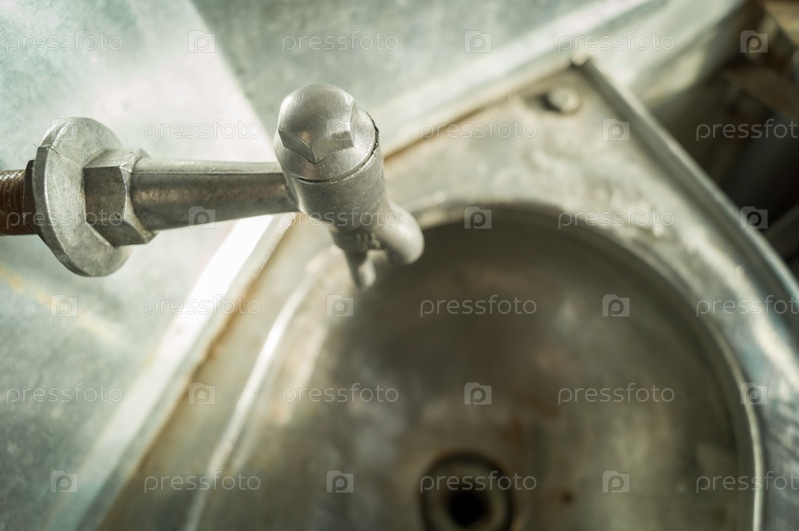 Кран с водой над раковиной в старом туалете пассажирского вагона электрички. Оборудование туалетов в вагонах поездов. Селективный фокус