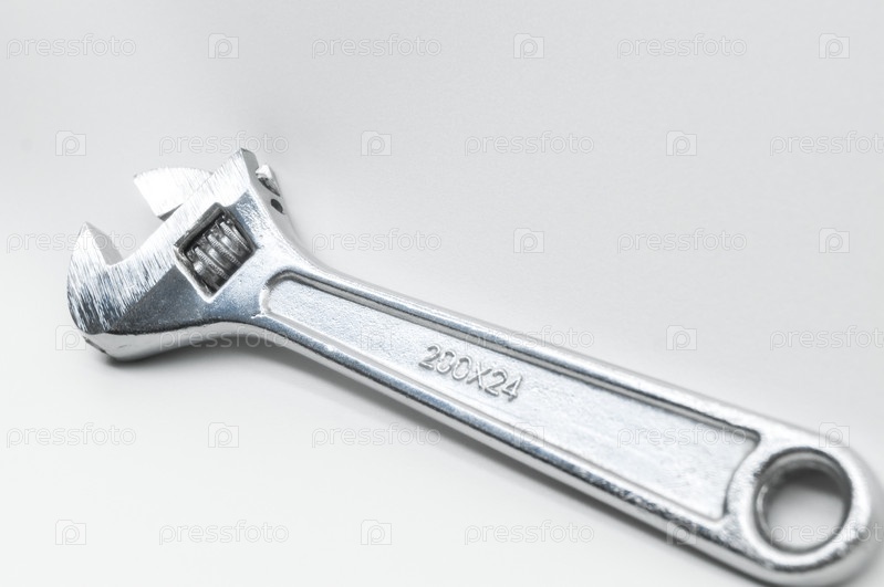 Разводной ключ на белом фоне. Ручной регулируемый ремонтный инструмент. Большой ключ из нержавеющей стали. Новый гаечный ключ. Селективный фокус