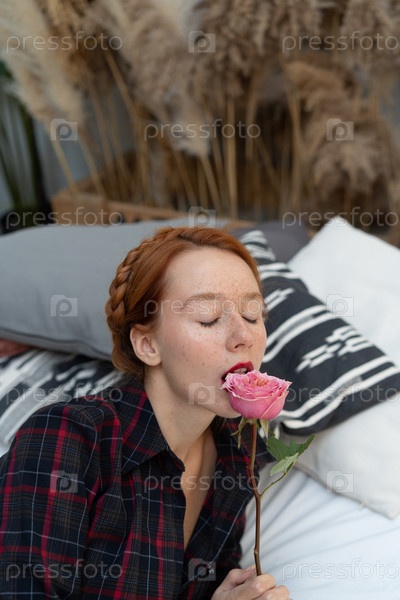 Портрет молодой красивой женщины с розой возле лица