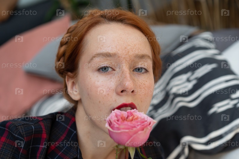 Портрет молодой красивой женщины с розой возле лица