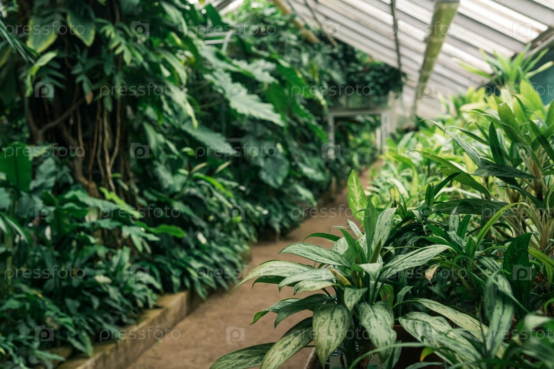 Интерьер большой оранжереи с коллекцией тропических растений