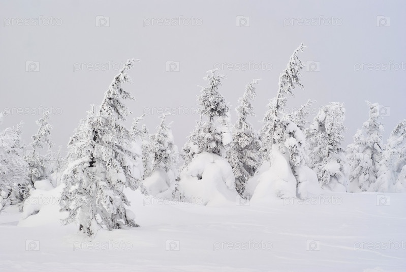 Зимний горный пейзаж - заснеженный лес в морозной дымке