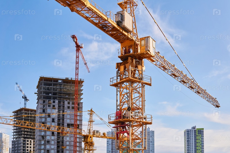 Строительные башенные краны на строительной площадке на фоне неба