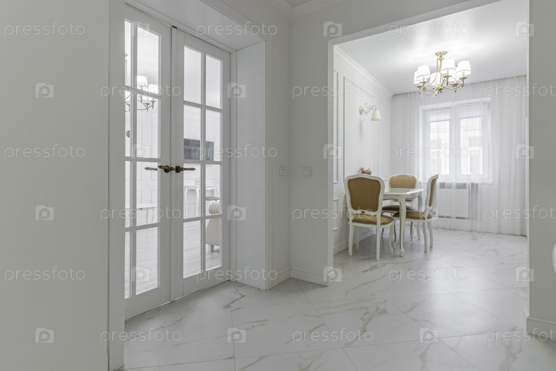 Отдельно стоящая чаша для ванны, расположенная в коридоре квартиры, с золотыми ножками и большим зеркалом на стене