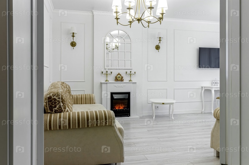 Интерьер в светлых тонах с биокамином, освещенным горящими бра на стене