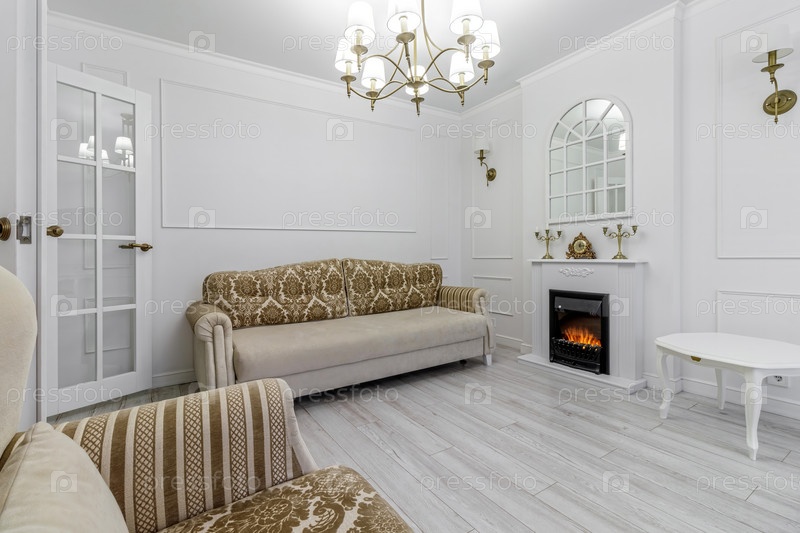 Интерьер в светлых тонах с биокамином, освещенным горящими бра на стене