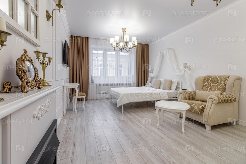 Интерьер в светлых тонах с биокамином, освещенным горящими бра на стене