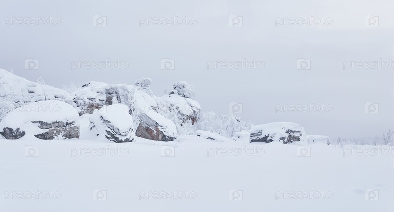 Заснеженные гранитные скалы посреди белой тишины под хмурым небом