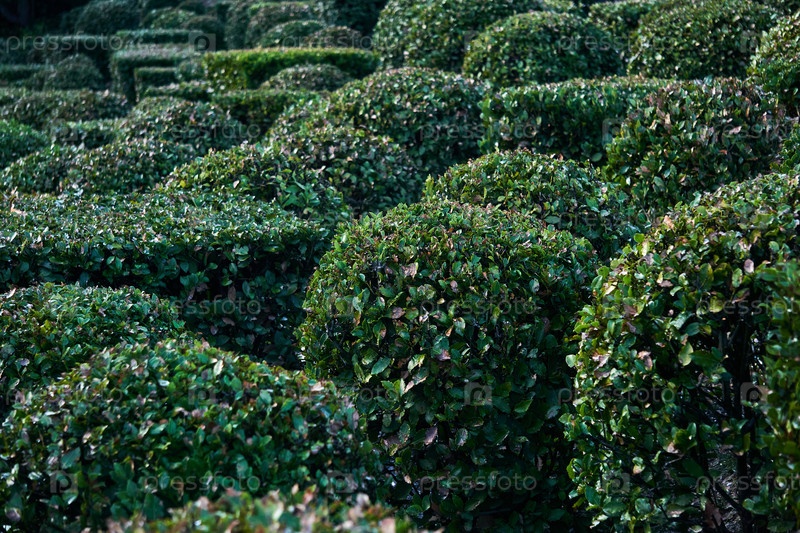 Подстриженные кустарники различной формы зимуют в саду французского формата