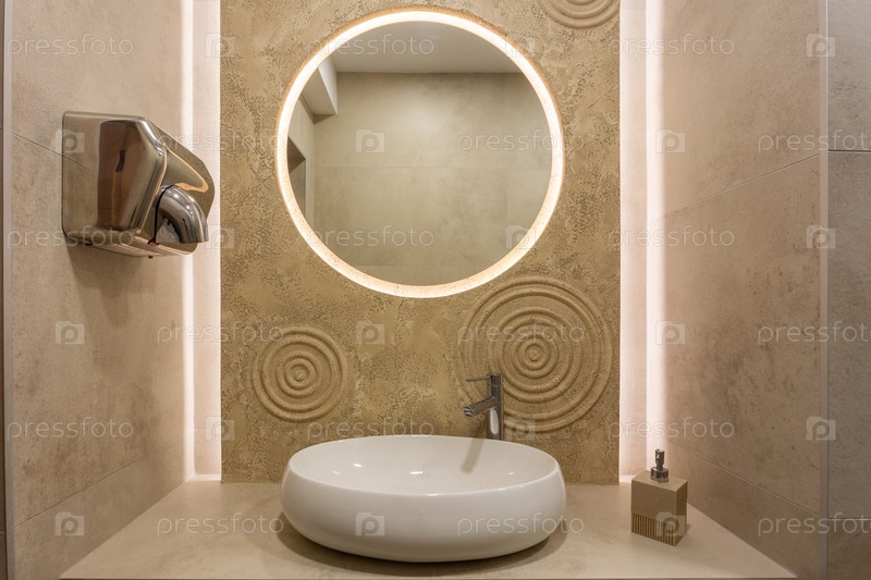Интерьер общественного туалета в кафе, ресторане или баре с умывальником, круглым зеркалом и сушилкой для рук