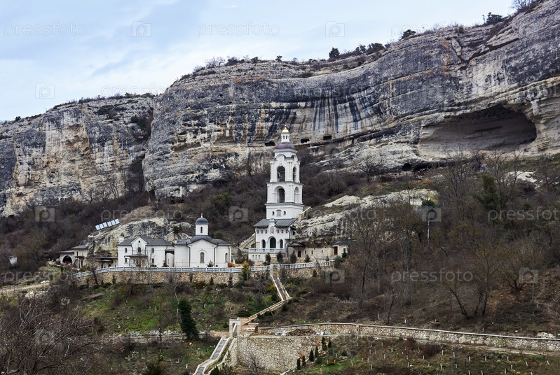 Церковь, колокольня и хозяйственные постройки Успенско-Печерского монастыря на фоне скалы в Бахчисарае, Крым