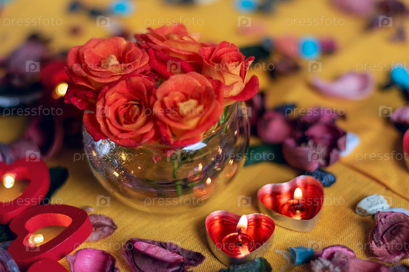 Букет роз, свечи и подарки, открытка на 14 февраля, День Святого Валентина, 8 марта, свадьба, день рождения, день матери, размытый фон, боке