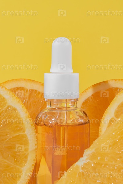 Ярко-желтый фон с флаконом-капельницей цитрусовой сыворотки для лица с витамином С и ломтиками свежего апельсина, символизирующими преимущества ухода за кожей. Макет, уход за кожей
