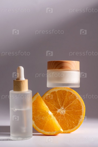 Цитрусовая косметика с витамином С и дольками апельсина на сером фоне. Сыворотка для лица во флаконе-капельнице и баночке с кремом. Пустая упаковка для дизайна