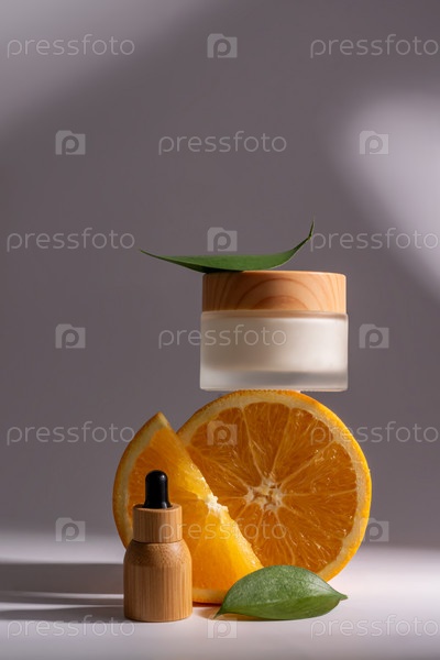 Освежающая косметическая процедура для ухода за кожей с апельсином и цитрусовыми. Увлажняющий крем для лица и косметическая сыворотка в бамбуковой бутылке-капельнице на сером фоне. Концепция естественного тоника для здоровья кожи