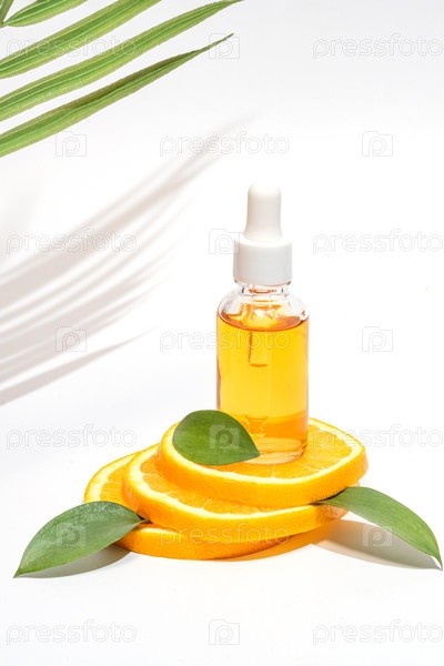 Яркая и освежающая экспозиция флакона с сывороткой с витамином С на подиуме из ломтиков свежего апельсина и зеленых листьев