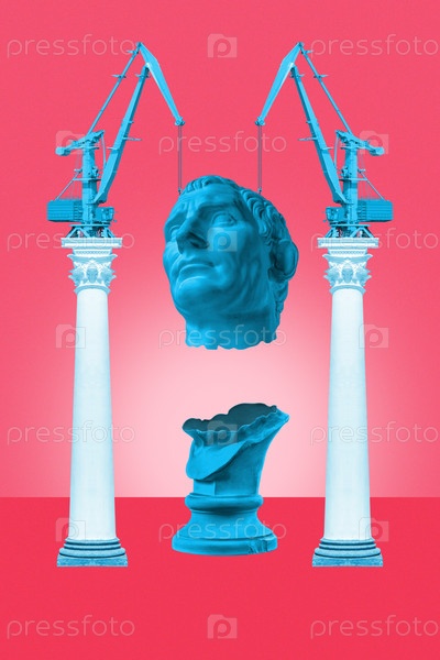 Коллаж в стиле поп-арт с головой античной статуи, промышленными объектами и деталями техники. Сюрреалистический плакат. Альтернативная зин-культура. Цифровое искусство. Дизайн шаблонов для искусства, диджеев, моды, плакатов, журналов