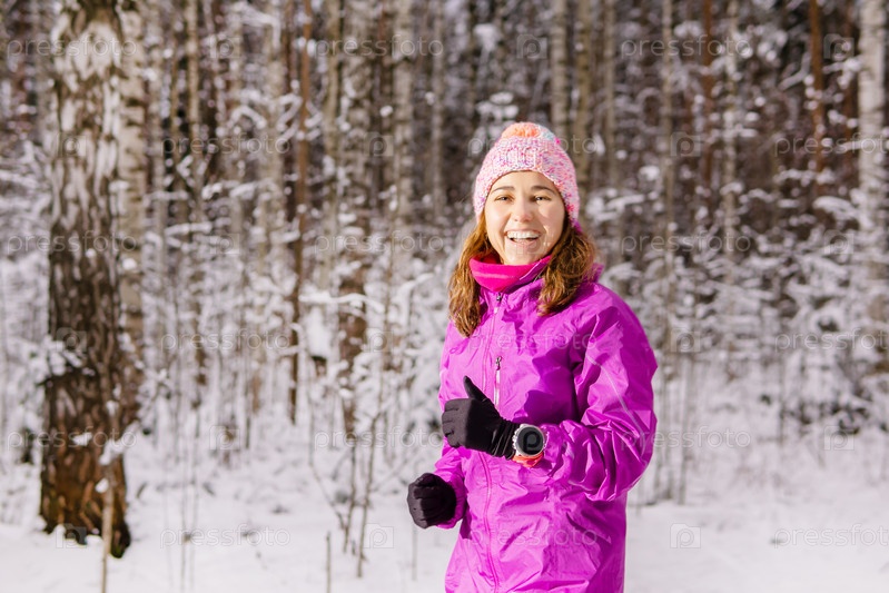 Девушка весело смеется во время зимней пробежки в парке