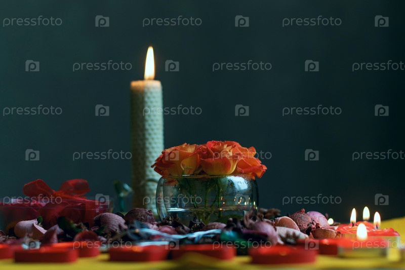 Букет роз, свечи и подарки, открытка на 14 февраля, День Святого Валентина, 8 марта, свадьба, день рождения, день матери, размытый фон, боке
