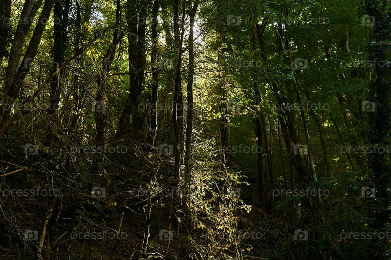 Солнечные лучи пробиваются сквозь заросли мшистого тропического леса умеренного пояса