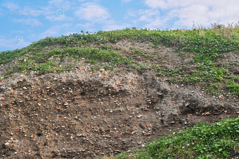 Оккупационная земля - слои земли с фрагментами древней керамики и ракушками под слоем дерна