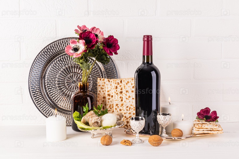 Понятие еврейской Пасхи. Традиционная кошерная еда на праздник, цветы в вазе. Горящая свеча. праздничный натюрморт к празднику