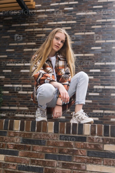 Молодая женщина сидит возле кирпичной стены городского здания