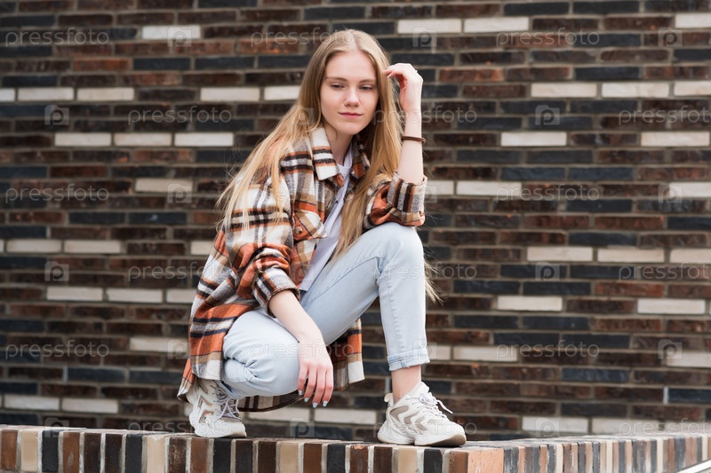Молодая женщина сидит на обочине возле кирпичной стены городского здания