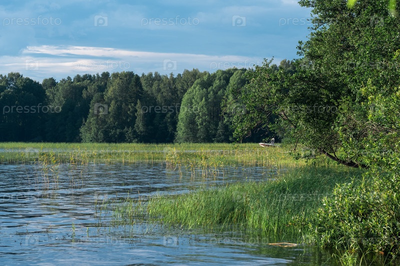 Лесистый берег озера с тростниковыми зарослями в солнечный день, в камышах видна рыбацкая лодка