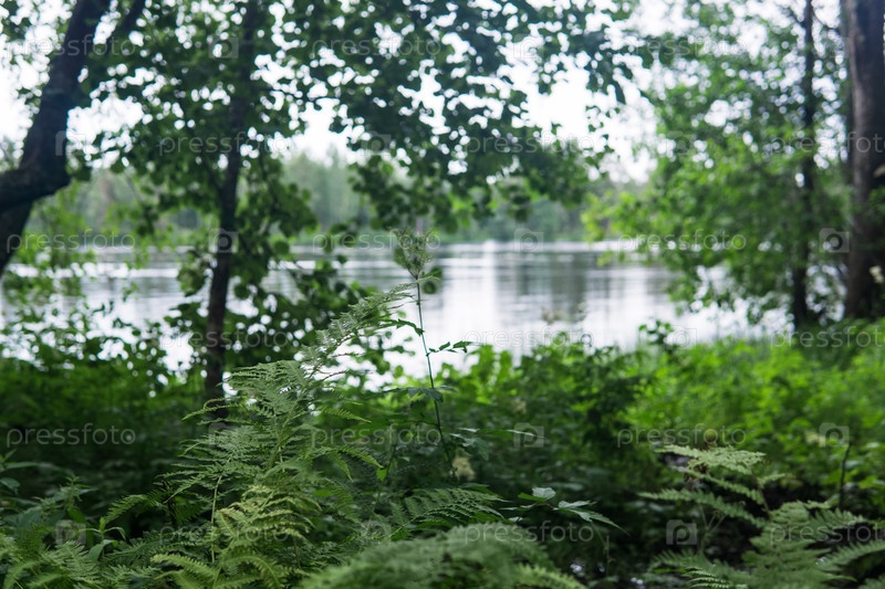 Вид из лесной чащи на берег лесного озера, сосредоточьтесь на близлежащих папоротниках