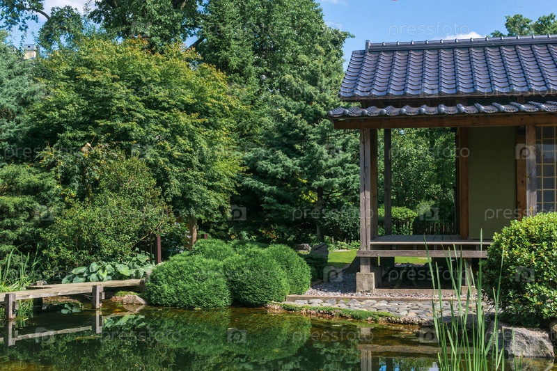 Японский сад с прудом, зигзагообразным мостиком и чайным домиком