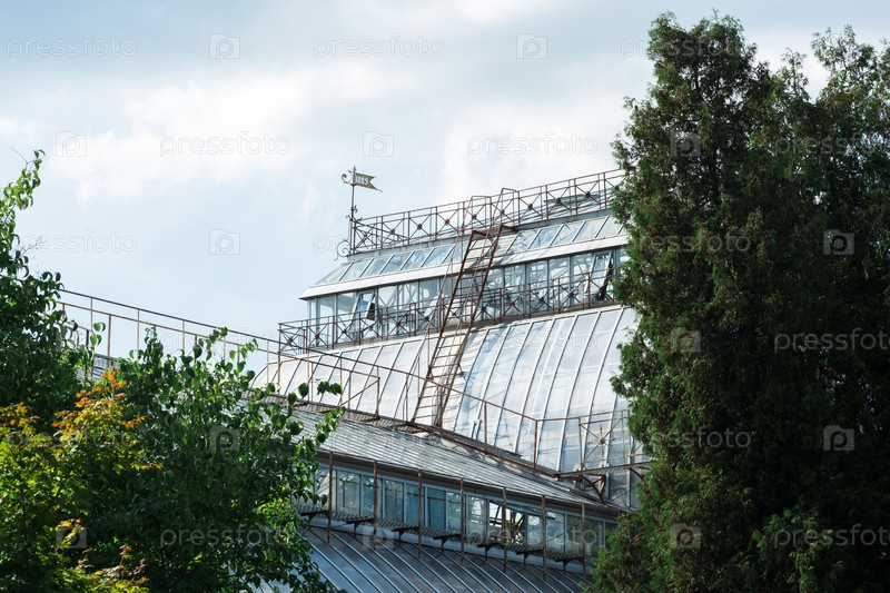 Вид на купол большой старинной пальмовой теплицы за деревьями