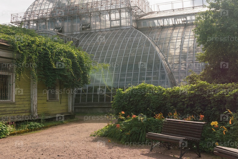 Уголок старого ботанического сада с огромной старинной оранжереей на заднем плане